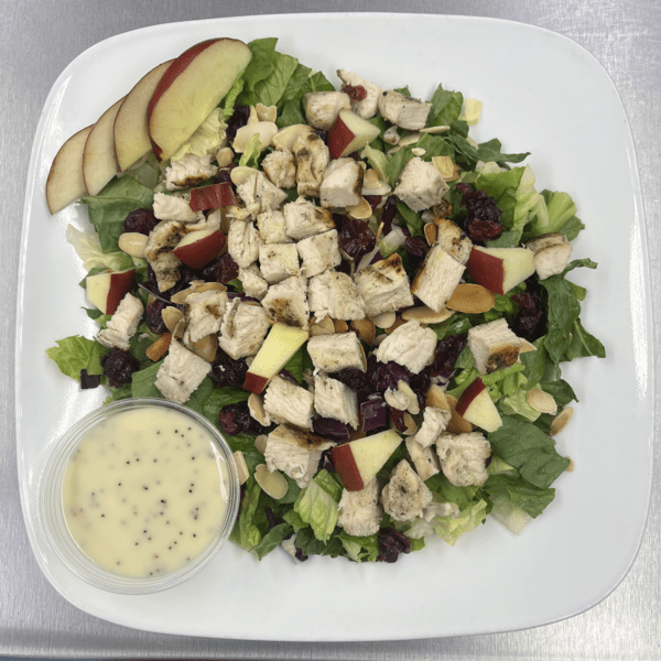 A Crisp Salad Served With Your Choice of Chicken, Dried Cranberries, Apple Pieces, Almonds, and Your Choice Of Dressing!